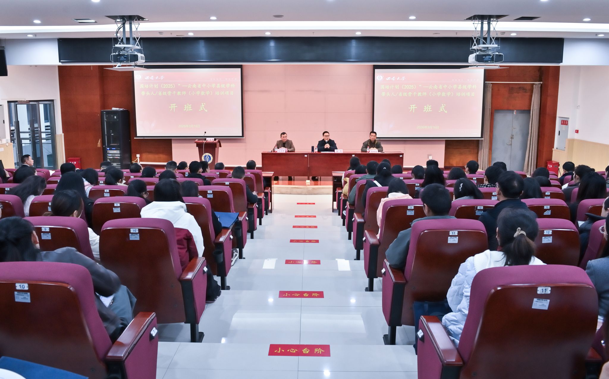 2026年3月16日上午,国培计划(2025)——云南省中小学县级学科带头人、省级骨干教师培训(小学数学) 开班仪式在西南大学隆平楼204报告厅隆重举行。开班仪式由西南大学教师教育学院继续教育办公室主任杜正雄主持。西南大学教师教育学院党委书记郭亮、原副院长李世讴及培训班全体学员参加仪式。