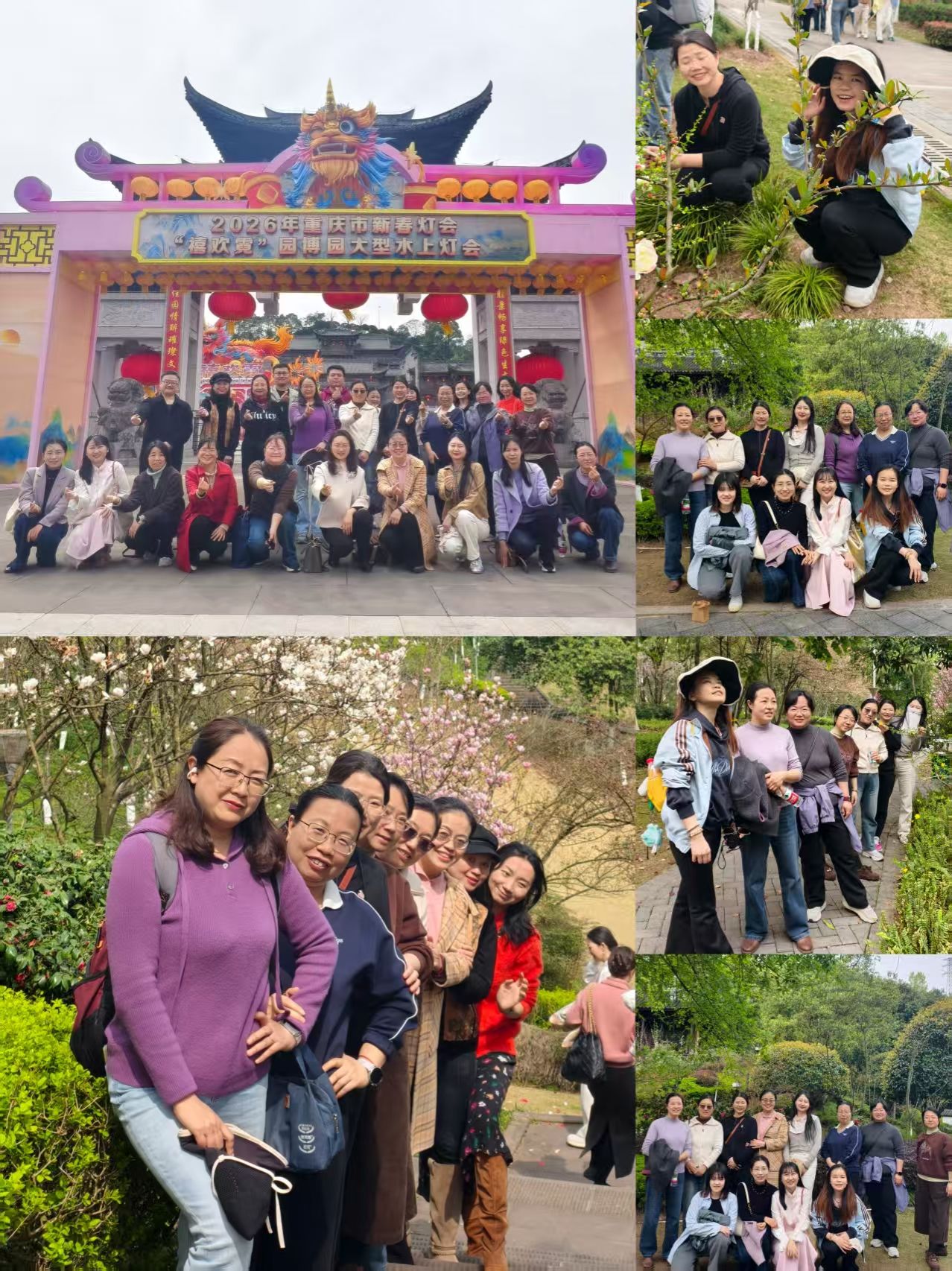 按照活动安排,教职工集体乘车前往重庆园博园,在主广场拍摄了合影,分组入园自由游览。园内春意盎然,山茶、海棠、玉兰等花卉竞相绽放,亭台楼阁与湖光山色交相辉映。老师们三五成群,漫步林间步道,品味园林韵味,享受闲暇时光。