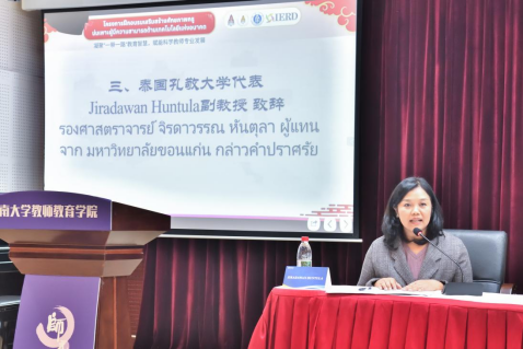 东盟教师专业发展研究院代表Phongthanat Sae-joo发言。他谈到,此次培训项目是孔敬大学与西南大学之间的合作成果,旨在提升教育工作者能力,增强教师数字创新与人工智能技术,既契合联合国可持续发展的目标,也回应教育工作者的新时代需求。此前,第一阶段培训活动已经圆满完成,期待在即将开启的第二阶段培训活动中,中泰师生继续潜心钻研、互学互鉴,为两国教师可持续发展进一步奠定扎实基础。