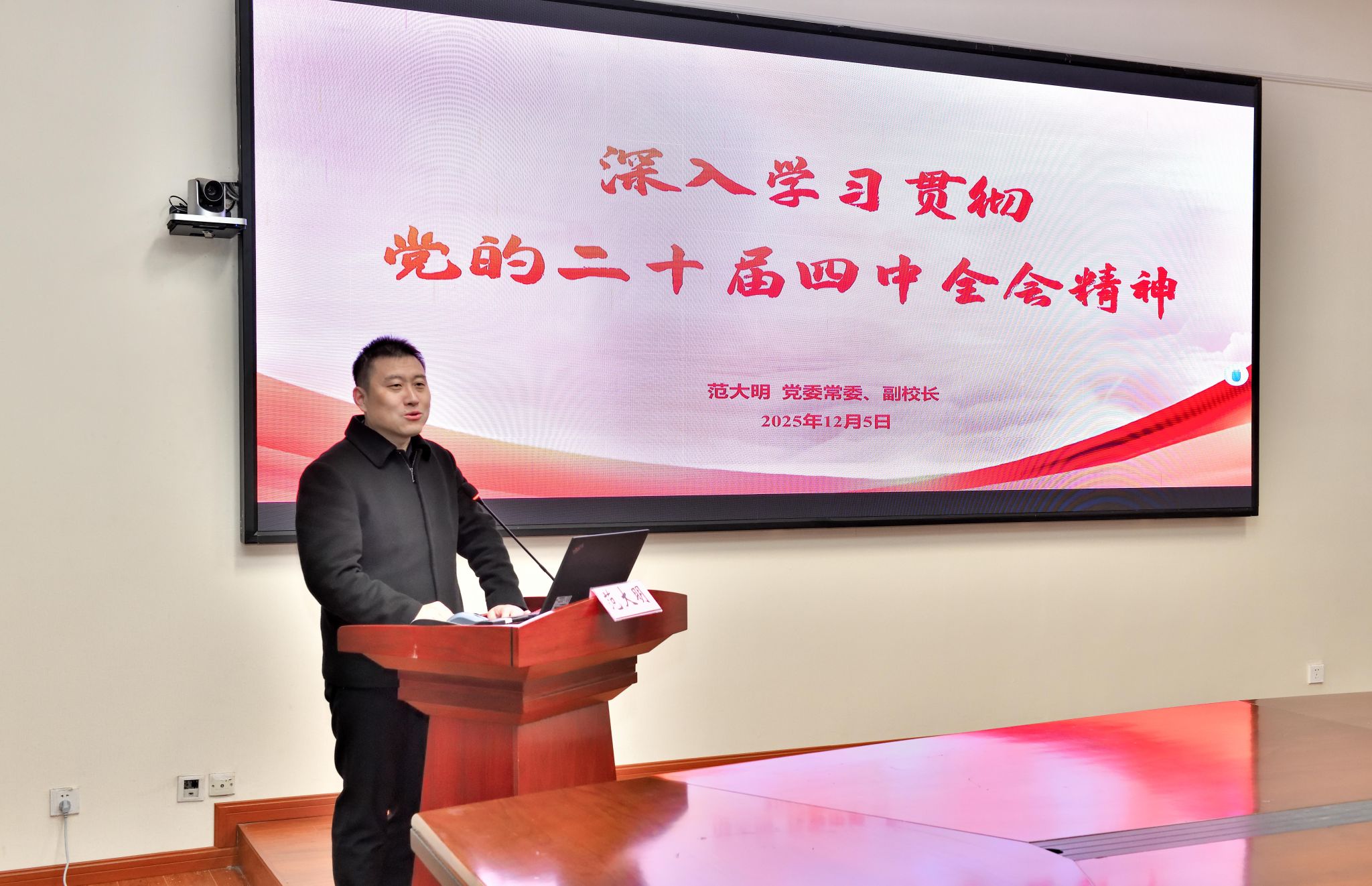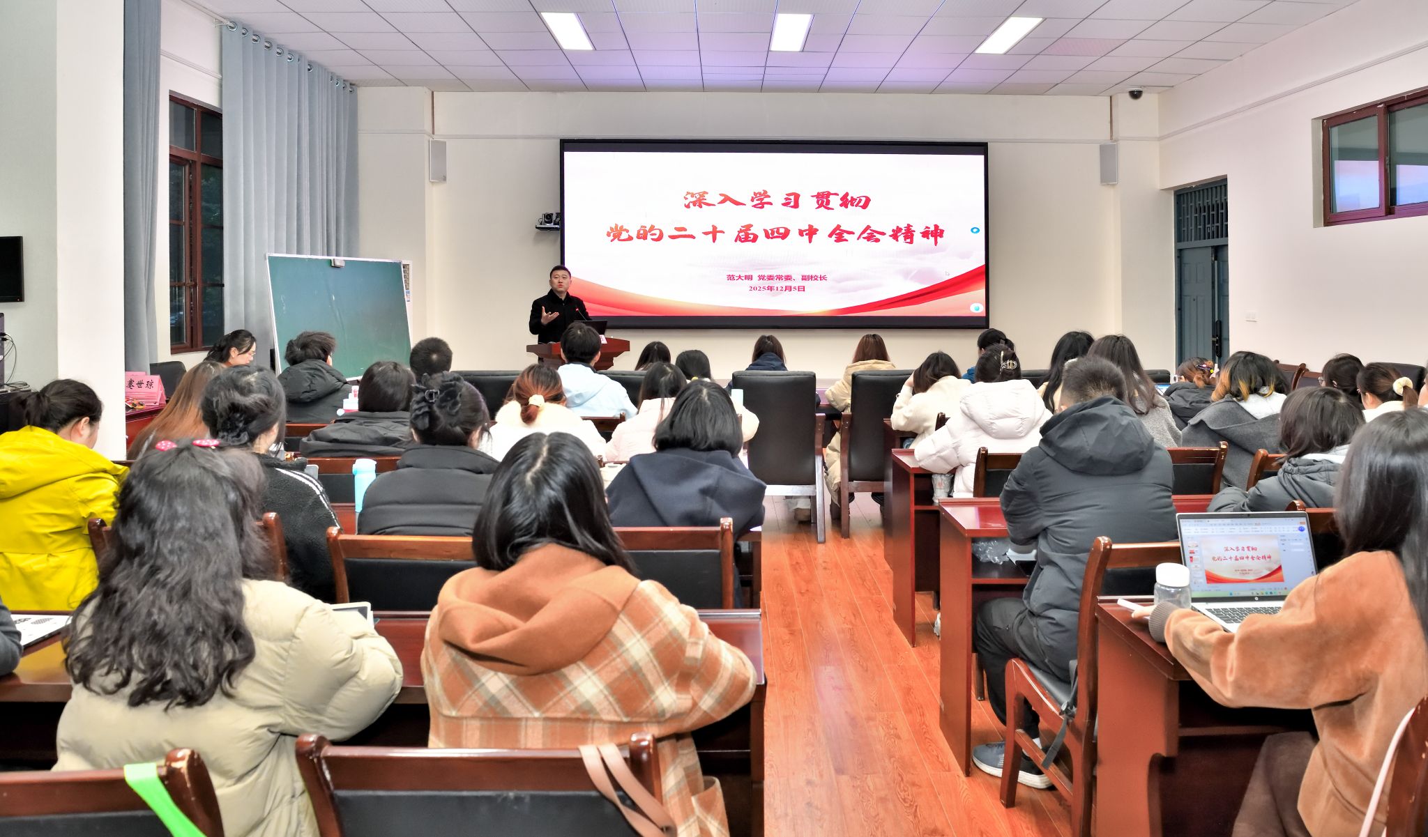 宣讲中,范大明副校长立足国际国内发展大势,系统阐述了全会的重大历史意义与时代价值。他指出,当前全球形势变乱交织、国际经济政治格局深刻演变,特别是中美大国博弈进入关键阶段,我国正处于中国式现代化纵深推进、全面跃升的关键时期,这次全会的召开既是对过往发展成就的系统总结,更是对未来发展方向的科学谋划,是一次具有全局性、历史性和具有里程碑意义的重要会议。