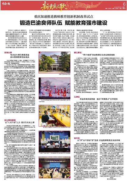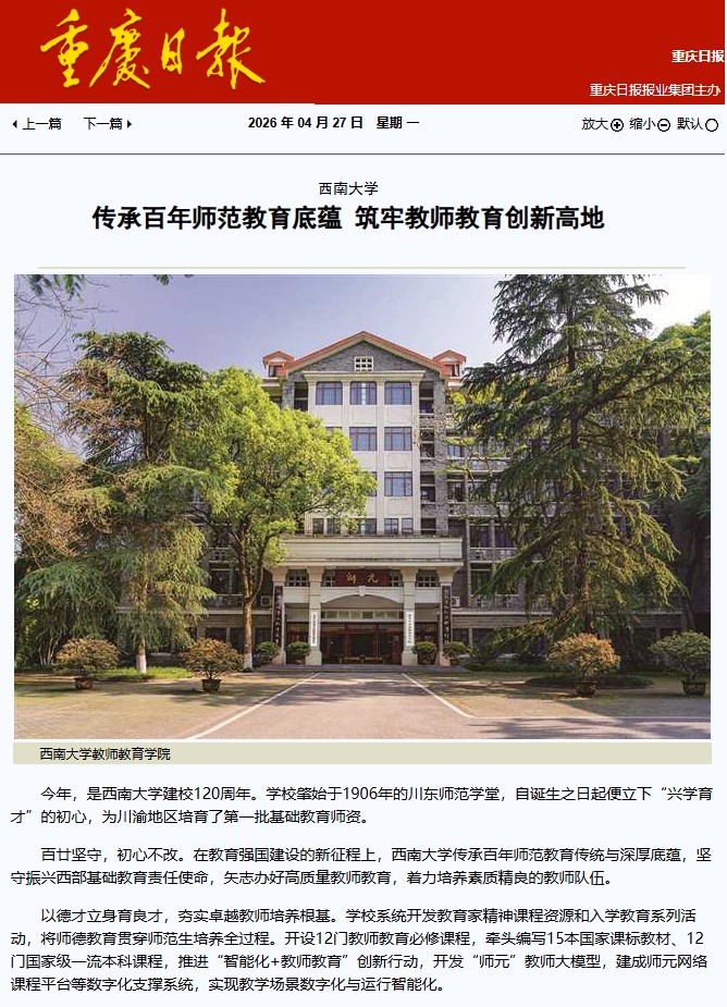 4月27日,《重庆日报》第6版专版刊发《锻造巴渝良师队伍 赋能教育强市建设——重庆加速推进教师教育创新机制改革试点》,介绍了重庆市作为西南地区唯一入选“教师教育创新机制改革试点单位”省市,系统构建“1356N”改革体系,打造教育强市的改革行动。其中,以《传承百年师范教育底蕴 筑牢教师教育创新高地》为题,报道了西南大学在其中的积极作为和卓越贡献。