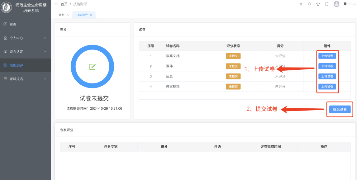 3.学生测评材料提交流程:通过进入校园网(https://www.swu.edu.cn)点击--办事大厅--用本人帐号登陆--师范生全生命周期管理系统--技能测评--上传文件并点击提交试卷,完成材料提交流程。如图所示: