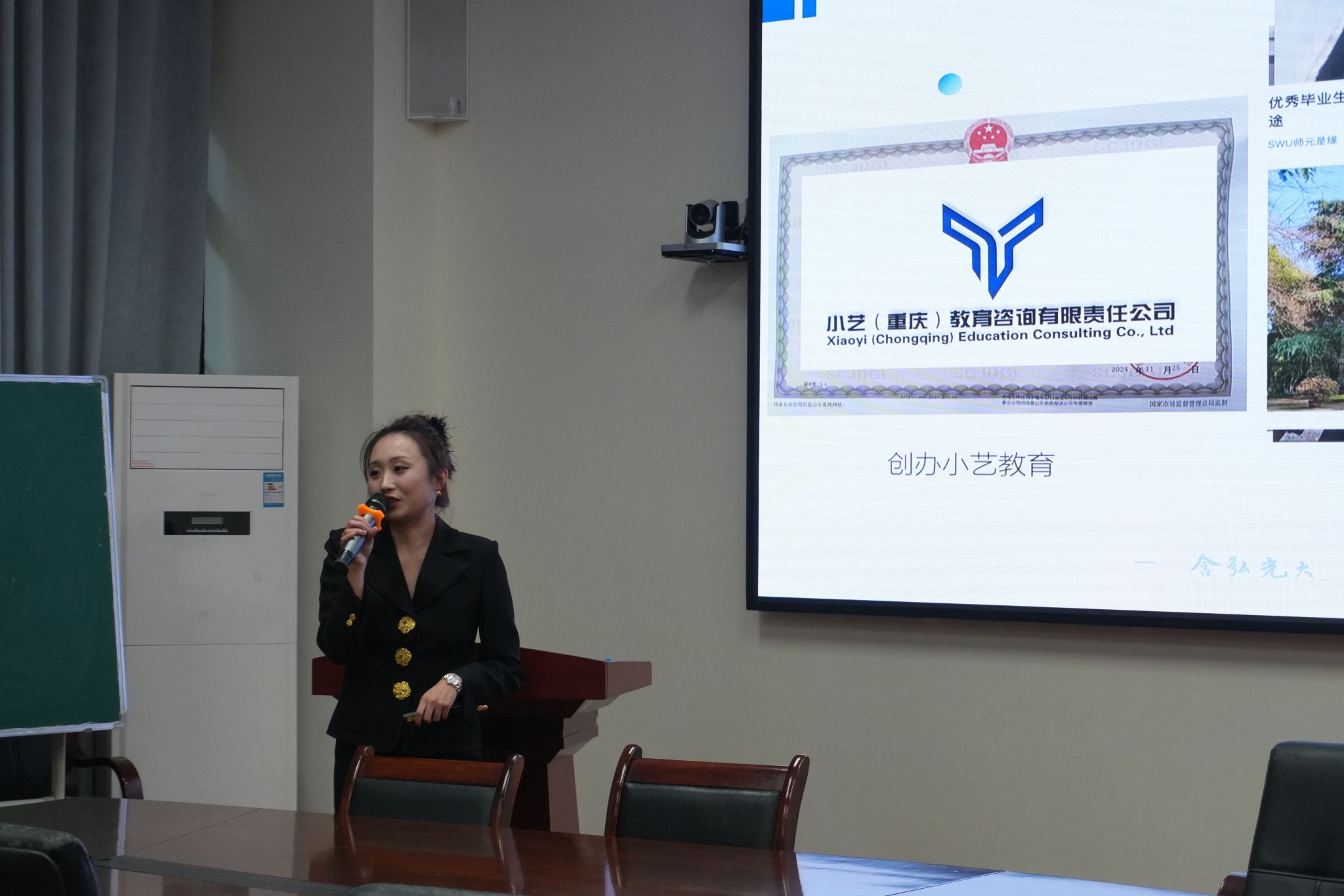 分享会上,符天艺以“从校园到创业:八年教育路的坚守与突破”为主题,复盘个人成长与企业发展的双向奔赴之路。本科阶段,她跨界深耕教育赛道,凭借扎实专业能力成长为学而思金牌讲师,更牵头斩获国家级认证的高校师资匹配项目;2021年“双减”政策调整期,她坚定转型自主创业的方向;读研期间,借西南大学访学契机拓宽国际教育视野,同时以学院团委副书记、实习辅导员的多重身份,系统积累教学实践与团队管理经验,为创办小艺教育筑牢根基。